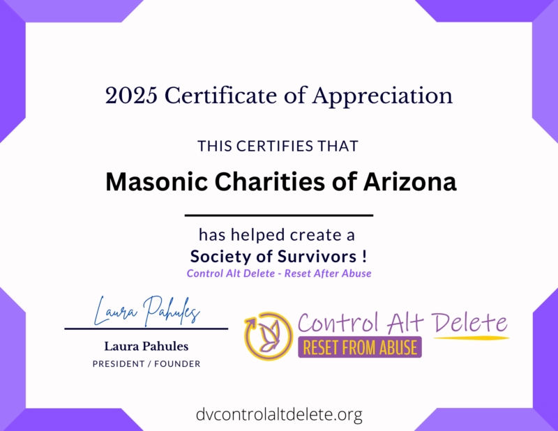 Control Alt Delete is deeply grateful to Masonic Charities of Arizona for their continued support of our mission. Their generosity is more than a grant—it is life-saving support for Survivors of domestic violence in Mesa, Arizona.